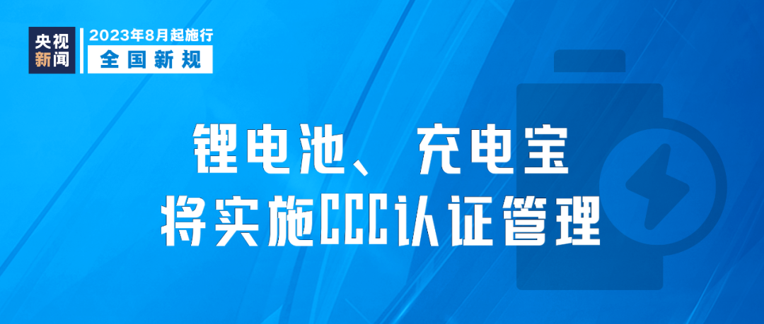 市場(chǎng)監(jiān)管總局發(fā)布公告,自2023年8月1日起,對(duì)鋰離子電池和電池組、移動(dòng)電源實(shí)施CCC認(rèn)證管理;自2024年8月1日起,未獲得CCC認(rèn)證證書和標(biāo)注認(rèn)證標(biāo)志的,不得出廠、銷售、進(jìn)口或者在其他經(jīng)營(yíng)活動(dòng)中使用。