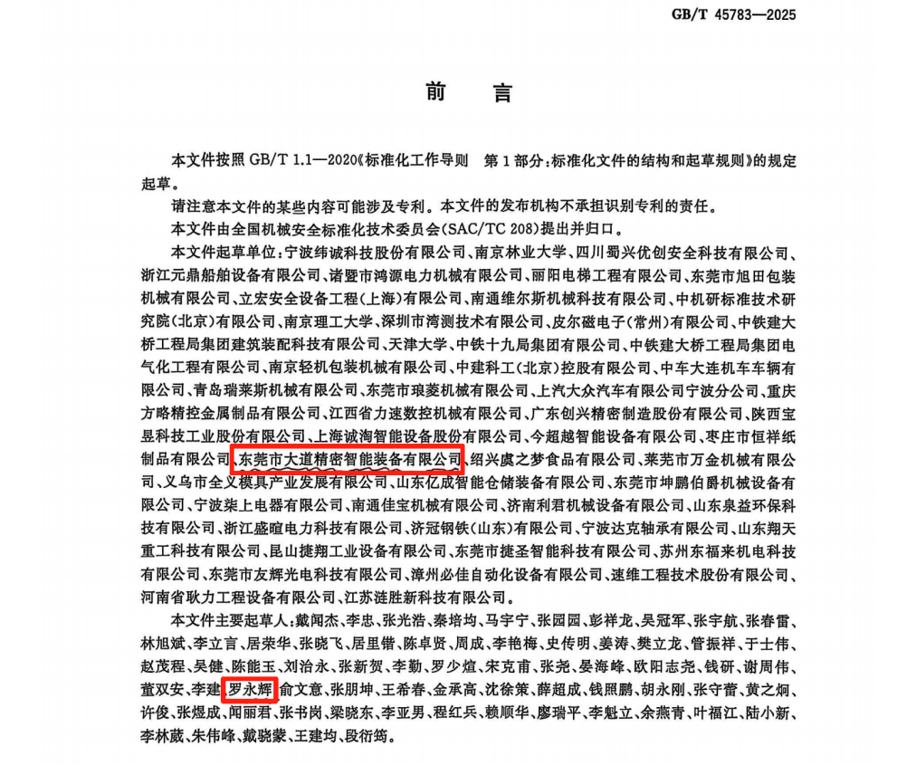 近日,東莞市大道精密智能裝備有限公司(以下簡稱“大道精密”)喜訊頻傳:公司作為文件起草單位參與制定的國家標(biāo)準(zhǔn)《GB/T 45783-2025 機(jī)械安全 安全防護(hù)授權(quán)系統(tǒng) 基本要求》正式發(fā)布,同時榮獲廣東省工業(yè)和信息化廳頒發(fā)的“專精特新中小企業(yè)”稱號。雙重榮譽不僅是對企業(yè)技術(shù)研發(fā)能力的高度認(rèn)可,更彰顯了其在推動行業(yè)標(biāo)準(zhǔn)化進(jìn)程和智能制造安全發(fā)展中的引領(lǐng)作用。